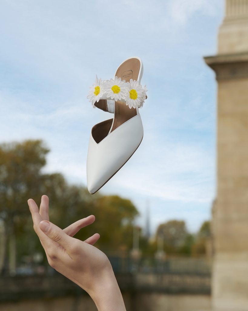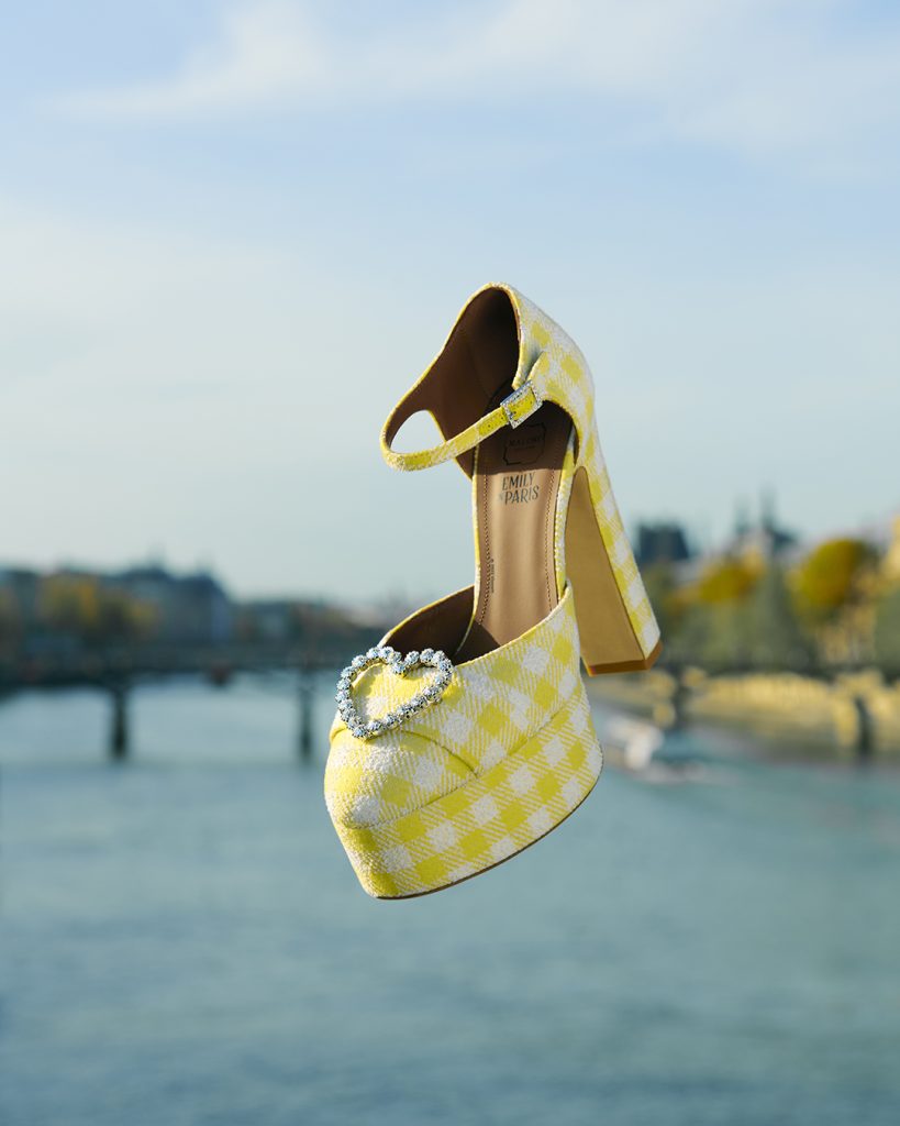 As with the show itself, taking centre stage in the collection is Emily, a brand-new silhouette that’s set apart by a striking statement bow on the vamp. The Emily will be available in a number of iterations, from evening-ready black and white satin to whimsical pink gingham, alluding to our protagonist’s eclectic sense of fashion. Next is the romantic and sophisticated Camille, inspired by the character of the same name: Emily’s confidante and guide to all things French. Taking Camille’s elegant personal style as a starting point, the shoe is graceful and purposeful in its shape, with a large, crystallised heart motif on the toe. And then there is the Mindy, named for Emily’s closest friend and fellow outsider to Parisian culture. Drawing on Mindy’s signature glamour and love of performing, the brand designed this shoe as an eye-catching number, replete with organza appliqué flowers across the toe.