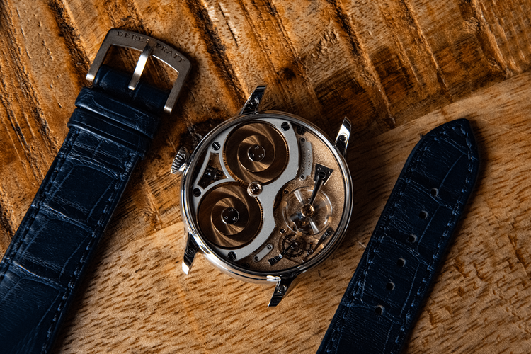 Mechanism: Remontoir d’égalité to the second with direct dead-beat seconds on the remontoir pignon. Free sprung balance wheel with glucydur timing masselottes, frequency of 18,000 v.p.h. Hairspring with Breguet over-coil, adjusted and counted in-house. Double Flying Barrels inspired by the “motor system” construction.