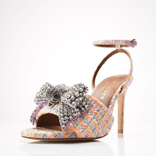 Kurt Geiger London showcases a decadent trend duo for SS23. While ‘Some Like it Hot’ serves up a cocktail of colours, ‘New Romantics’ co- exists with a more delicate mix of macaron pastels. Fruit embellishment evokes Carmen Miranda energy, London vibrancy is reflected with bustling floral and scarf prints, and Soho’s rooftop-sunset is conveyed through glistening lurex fabrics and hot metallics. In contrast, ‘New Romantics’ offers a sugar-sweet colour palette crafted in lightweight tweeds, available in coordinating shoes and handbags, alongside new season handbags crafted in tactile crochets.